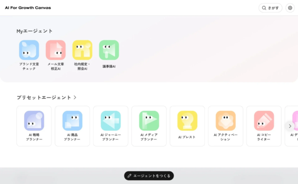 「AI For Growth Canvas」は、従来の機能中心のインターフェースから一新され、鮮やかな色彩と親しみやすいアイコンデザインが採用されています。これにより、実務におけるAI利用への心理的なハードルを下げることが期待されます。